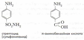 Дополнительный материал к § 34 Аминокислоты, пептиды, полипептиды и белки в природе и жизниВ природе аминокислоты встречаются как в составе пептидов и белков, так и в свободном виде, а также в составе других соединений. Например, n-аминобензойная кислота является составной частью витаминов группы В. Широко известный лекарственный препарат стрептоцид (сульфаниламид) по составу и строению очень похож на n-аминобензойную кислоту. Он защищает организм от воздействия микробов.