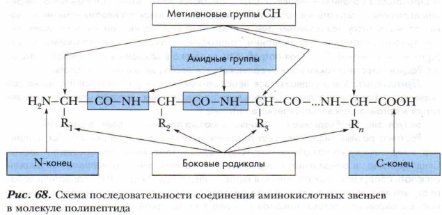 Однако наибольшее значение аминокислоты имеют именно в качестве строительного материала для биополимеров. Как уже отмечено выше, а-аминокислотам принадлежит выдающаяся роль в природе — они служат мономерами, из которых построены все растительные и животные белки. В организме человека непременно имеются аминокислоты, содержащие серу: цистеин и метионин. Интересно, что почти все 1 50 г серы, присутствующие в организме взрослого человека, входят в состав белковых молекул волос, кожи и ногтей. Аминокислоты, необходимые для построения белков организма, человек и животные получают из белков пищи. 12 из 20 α-аминокислот, входящих в состав белков, могут синтезироваться в организме человека. Они называются заменимыми. Остальные 8 непременно должны содержаться в продуктах питания. Они называются незаменимыми аминокислотами. К числу незаменимых аминокислот относятся: валин, лейцин, изолейцин, лизин, треонин, метионин, фенилаланин, триптофан, а для детей ещё две аминокислоты (аргинин и гистидин). Суточная потребность человека в каждой из этих кислот — около 1 г. Рацион животных также должен содержать все необходимые аминокислоты. Проблема. Мясо содержит все необходимые человеку аминокислоты, но не все люди употребляют его в пищу. Сформулируйте требования, которые должны предъявляться к организации вегетарианского питания. Безусловно, необходимые аминокислоты можно получить из белков растений. Растения разных видов содержат различающиеся наборы аминокислот. Так, например, в зерновых культурах обычно отсутствует одна незаменимая аминокислота — лизин. Следовательно, в дополнение к зерновым рацион вегетарианца непременно должен включать продукты из тех растений, в которых лизин содержится. Исследователи полагают, что традиционные для народов некоторых стран сочетания продуктов (соевых бобов с рисом на востоке, макарон с сыром в итальянской кухне и др.) обусловлены именно этим. Применение аминокислотПри сильном истощении и после тяжёлых операций больным назначают аминокислоты в виде лекарственных препаратов. Многие α-аминокислоты используют при лечении различных заболеваний: нервных, желудочно-кишечных, глазных и др. Некоторые аминокислоты применяются в сельском хозяйстве для подкормки животных, что положительно влияет на их рост. Натуральный шёлк состоит из молекул белка кератина, построенных в основном из глицина, аланина и в меньшей степени — из других аминокислот. Некоторые сорта синтетического шёлка (капрон, энант) получают из аминокислот. В промышленности аминокислоты получают путём гидролиза белков. Используются и синтетические способы их изготовления. Аминокислоты можно получать из соответствующих карбоновых кислот через промежуточное получение хлорпроизводного карбоновой кислоты. Как мы уже знаем, белки как разновидность пептидов представляют собой соединения, построенные из остатков α-аминокислот. Задание. Прокомментируйте схему на рисунке 68. Условно принято считать, что пептиды содержат в своих молекулах до 100 аминокислотных звеньев. При этом их молекулярная масса может достигать 10 000. Молекулы белков крупнее. Их полимерные цепи содержат свыше 100 аминокислотных звеньев. Соответственно, их молекулы имеют большую молекулярную массу — от 1 0 000 до нескольких миллионов единиц. Таким образом, условно можно счит
