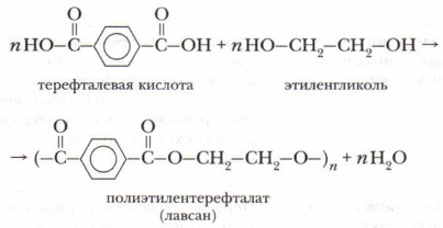 Полиамиды химически инертны и очень прочны. Поли-ε-капроамид используется как синтетическое волокно, которое применяется в текстильной промышленности, и как пластмасса для изготовления деталей машин (зубчатых колёс, подшипников). ЛавсанНазвание волокно получило по первым буквам слов «лаборатория высокомолекулярных соединений Академии наук», в которой оно впервые было получено. Лавсан относится к полиэфирным волокнам. Эта реакция идёт в присутствии катализаторов (Sb2O3, Со2O3) при высокой температуре (280 °С), давлении не менее 1,33 кПа. Процесс поликонденсации завершается через 6-8 часов. Превращение полимера в волокна происходит таким же образом, как и у капрона.