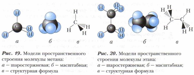 1. Используя комплект для составления шаростержневых моделей или пластилин двух цветов и спички, соберите шаростержневую модель молекулы метана (см. рис. 19). Для изображения атомов углерода используйте шарики чёрного цвета, а для изображения атомов водорода — шарики белого цвета. Если для составления моделей вы будете применять пластилин, то изготовьте шарики двух цветов (атомы углерода и водорода) и скрепите их между собой с помощью спичек (помните, что атомный радиус углерода больше атомного радиуса водорода). 2. Соберите шаростержневую модель молекулы этана (см. рис. 20). Для этого в модели метана замените один атом водорода на группу атомов — CH3. 3. Самостоятельно соберите шаростержневые модели молекул бутана и пентана. Убедитесь, что атомы в молекулах могул- свободно вращаться вдоль химических связей. Основные понятия Предельные углеводороды (алканы) • Гомологи • Гомологический ряд • Шаростержневые и масштабные модели молекул углеводородов Вопросы и задания