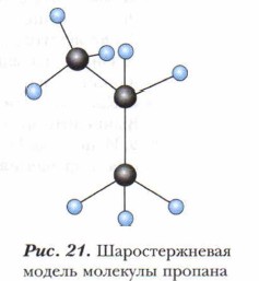 Начиная с пропана, атомы углерода расположены в пространстве не по прямой линии, а зигзагообразно (рис. 21). Валентные углы в молекулах гомологов метана отличаются от идеальных значений, например, в пропане угол С—С—С равен 112,5°, а валентные углы Н—С—Н могут иметь значения от 104 до 106°. Убедимся на практике в том, что молекулы углеводородов имеют зигзагообразное строение. Для этого построим шаростержневые модели некоторых алканов, помня о том, что атом углерода в предельных углеводородах находится в состоянии sp3-гибридизации.