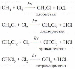 2. Реакции замещения. Для алканов характерны реакции радикального замещения, в ходе которых атом водорода замещается на атом галогена или какую-нибудь группу атомов. Атом углерода в предельных углеводородах находится в состоянии sр3-гибридизации. Это значит, что химические реакции, в которые они вступают, связаны с разрывом весьма прочных σ-связей (С—С и С—Н). А. Галогенирование. Примером может служить реакция с хлором, при которой происходит последовательное замещение атомов водорода на атомы хлора под действием света или нагревания.