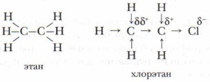 В итоге электронная плотность в молекуле хлорэтана по сравнению с молекулой этана смещена в сторону атома хлора. Связь «углерод — углерод» становится полярной. Полярность одной ковалентной связи является причиной смещения электронной плотности соседних σ-связей в сторону атома более электроотрицательного элемента. В случае введения в углеродную цепь более электроотрицательных или более электроположительных заместителей проявляется индуктивный эффект.