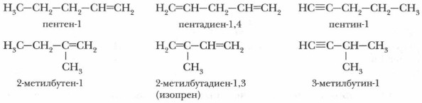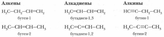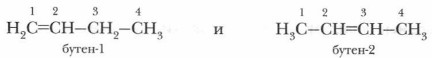 Углеводороды, в молекулах которых между атомами углерода имеется одна двойная связь, называются углеводородами ряда этилена, или алкенами. Общая формула алкенов — CnH2n. Углеводороды, в молекулах которых имеются две двойные связи, называются диеновыми, или алкадиенами. Общая формула алкадиенов — СnН2n-2. Углеводороды, в молекулах которых между атомами углерода имеется тройная связь, называются углеводородами ряда ацетилена, или алкинами. Общая формула алкинов — СnН2n-2 (об особенностях образования кратных связей см. § 5). Номенклатура непредельных углеводородов, разработанная IUРАС, схожа с номенклатурой предельных углеводородов. Названия алкенов образуют путем изменения суффикса -ан соответствующего предельного углеводорода на -ен, названия алкадиенов — на -диен, названия алкинов — на -ин. Выбирается самая длинная цепь атомов углерода, которая содержит двойную (или тройную) связь, и нумерация атомов углерода начинается с того конца, к которому эта связь ближе расположена. Например: