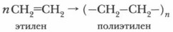 Аналогичный способ краткого написания формулы полимеров применяется и для других полимерных соединений. Продуктом реакции полимеризации этилена является полимер — полиэтилен. Исходное вещество (этилен) — мономер, повторяющееся звено (в данном случае — СН2—СН2—) — элементарное, или структурное, звено. Коэффициент n — количество молекул мономера, индекс n — степень полимеризации. Полимеры — механически прочный материал. Они широко используются в промышленности. Изделия из них газо- и влагонепроницаемы, не проводят электрический ток. При обычных условиях на них не действуют органические растворители, они устойчивы к действию концентрированных кислот и щелочей. Позже мы более подробно познакомимся со свойствами этих веществ и механизмом ракции полимеризации (см. с. 333).
