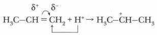 Положительно заряженный ион водорода (протон) — электрофильная частица атакует молекулу алкена, при этом π-связь поляризуется быстрее σ-связи и разрывается. Электрофил присоединяется к звену СН2, так как здесь скапливается бо́льший отрицательный заряд и образуется органический ион — карбокатион: