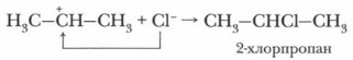 Карбокатион часто называют σ-комплексом, поскольку при его образовании формируется новая σ-связь. К карбокатиону затем присоединяется хлорид-ион и образуется 2-хлор- пропан:
