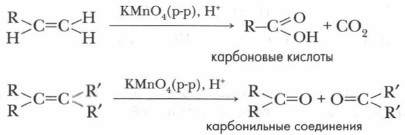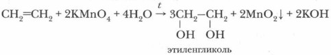 б) Окисление перманганатом калия (реакция Вагнера). При мягком окислении этилена и его гомологов происходит разрыв π-связи, и малиновая окраска раствора перманганата калия КМп04 исчезает. Эта реакция была открыта в 1888 г. русским химиком Е.Е. Вагнером, и носит его имя. Она также является ачественной реакцией на алкены.