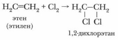 Атомы углерода из состояния sр2-гибридизации переходят в состояние sр3-гибридизации. При этом изменяется и пространственное строение молекулы. Из плоской молекулы этилена образуется объемная молекула этана. б) Галогенирование Алкены вступают в реакцию с галогенами. Например, с хлором: