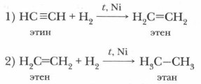 Проблема. Как влияет наличие тройной связи на химические свойства алкинов? 1. Реакции присоединенияАлкины легко вступают в такие реакции. Это объясняется тем, что природа трех связей у алкинов неодинакова. Две — π-связи и одна — σ-связь. Процесс присоединения идет в две стадии, вначале разрывается одна π-связь, затем другая. а) Гидрирование Эту реакцию можно рассматривать как реакцию восстановления, которая идет в присутствии катализатора (никеля, или платины, или палладия). В избытке водорода происходит полное насыщение алкинов, образуются алканы: