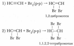 б) Галогенирование Алкины, как и алкены, обесцвечивают бромную воду. Эта реакция является качественной на алкины. Она также идет в две стадии: