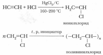 в) Гидрогалогенирование Ацетилен используется для получения винилхлорида, а из него получают поливинилхлорид (ПВХ):