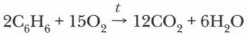 Физические свойства бензолаБензол — это легкокипящая (температура кипения 80,1 °С) бесцветная жидкость, не растворяется в воде. Имеет специфический запах. При охлаждении легко застывает и превращается в белую кристаллическую массу с температурой плавления 5,5 °С. Химические свойства бензола1. Реакция горенияКак все углеводороды, бензол сгорает с образованием углекислого газа и воды: