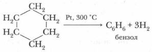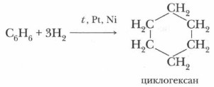Проблема. Какие можно сделать предположения о строении бензола? Опыт позволяет предположить, что бензол не образует прямую или разветвленную цепь, в которой находятся двойные или тройные связи. Это же самое доказывает и реакция гидрирования бензола. Экспериментально также установлено, что молекула бензола (1 моль) присоединяет только три молекулы водорода (3 моль), в результате чего получается циклическое соединение — циклогексан:
