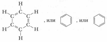Часто пользуются той структурной формулой бензола, в которой не указываются атомы углерода и водорода, а записывается только бензольное кольцо, где чередуются двойные и одинарные связи.