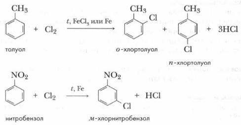 Дополнительный материал к § 18, 19 Ориентирующее действие заместителей в бензольном кольцеРассмотрим, как протекает реакция замещения хлором у метилбензола (толуола) и нитробензола.