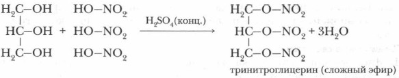 1. Вначале получите Сu(ОН)2: к 2 мл разбавленного раствора щелочи добавьте несколько капель раствора сульфата меди (II) до появления признаков реакции. 2. Добавьте к образовавшемуся гидроксиду меди (II) немного глицерина. Пробирку встряхните. Что наблюдаете? Как изменилось состояние веществ в пробирке и каким стал цвет раствора? Какие признаки химической реакции вы можете отметить? Результатом реакции глицерина с гидроксидом меди (II) является глицерат меди (сложное комплексное соединение ярко-синего цвета). Эта реакция — качественная реакция на многоатомные спирты, в т. ч. на глицерин и подобные соединения. Глицерат меди применяют при проведении клинического анализа для определения сахара в моче. Проблема. Чем объяснить способность многоатомных спиртов к взаимодействию с нерастворимыми основаниями? 3. Важной в практическом отношении является реакция нитрования. В результате реакции нитрования глицерина образуется такое нужное человеку вещество, как тринитроглицерин С3Н5(ОNO)2)3.