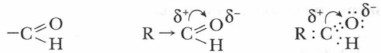 Атом кислорода как более электроотрицательный вызывает смещение электронной плотности к себе, на нем накапливается частичный отрицательный заряд, а на атоме углерода альдегидной группы, от которого оттянуты электроны, образуется частичный положительный заряд. Следовательно, двойная связь в группе полярна и способна по месту ее разрыва присоединять другие полярные молекулы.