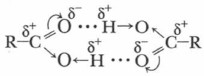 Усиление полярности связи в гидроксильной группе кислот определяет их способность к образованию более прочных, чем у спиртов, водородных связей. Экспериментальные исследования по определению молекулярных масс жидких карбоновых кислот показали, что они состоят из димеров — удвоенных молекул, образованных водородными связями: