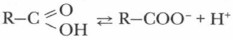 Было обнаружено, что даже в парах уксусной кислоты содержится смесь единичных молекул и димеров, а пары муравьиной кислоты образованы исключительно димерами. Энергия каждой водородной связи в димерах составляет около 7 кДж/моль. Следовательно, относительно высокие температуры кипения, а также и растворимость в воде первых гомологов рассматриваемого ряда карбоновых кислот объясняется их способностью к образованию водородных связей. Химические свойства карбоновых кислотХимические свойства карбоновых кислот обусловлены в первую очередь вышерассмотренными особенностями их строения. 1. Растворимые кислоты диссоциируют в воде