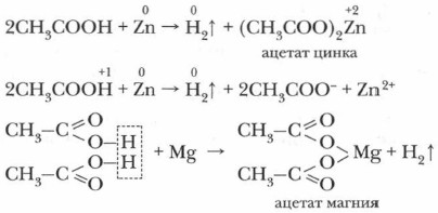 Благодаря наличию в воде иона Н+ они имеют кислый вкус, способны изменять окраску индикаторов и проводить электрический ток. В водном растворе эти кислоты — слабые электролиты. С увеличением углеводородного радикала снижается степень диссоциации и сила кислот в разбавленных растворах. 2. Карбоновые кислоты (особенно растворимые в воде) обладают химическими свойствами, характерными для растворов неорганических кислот, т. е. взаимодействуют с металлами, их оксидами, гидроксидами и слабыми солями. а) Взаимодействие с металлами (активными и среднеактивными) с образованием солей: