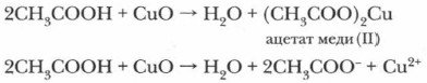 г) Взаимодействие с солями слабых кислот: 2СН3СООН + NaHCO3 → CH3COONa + Н2O + CO2↑
