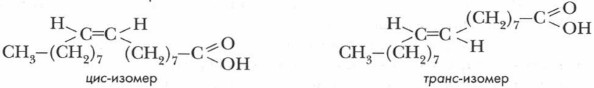 Глава 9. Карбоновые кислоты и сложные эфиры Непредельные одноосновные карбоновые кислотыЭкспериментальным путем было установлено, что обычная олеиновая кислота (маслообразная жидкость с tпл = 16 °С) — цис-изомер (см. рис. 49). Однако при определенных условиях (например, под действием азотистой кислоты) она способна превращаться в транс-изомер — твердое вещество с tпл = 51-52°С, называемое элаидиновой кислотой. Молекулы цис-изомера более упорядоченны и короче. Молекулы транс-изомера вытянуты в пространстве, поэтому силы межмолекулярного взаимодействия между ними проявляются значительно сильнее. В этом заключается причина различия физических свойств двух пространственных изомеров.