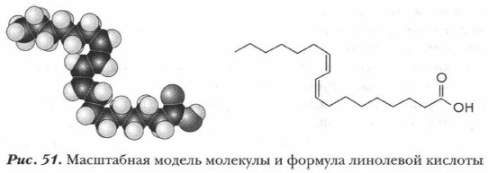 В одноосновных карбоновых кислотах может быть не одна двойная связь, а две или три. Такие кислоты называются полинепасыщенными. Например, в молекулах линолевой кислоты содержатся две двойные связи (рис. 51), а в молекулах линоленовой — целых три. В конце 80-х гг. XX в. из рыбьего жира были выделены еще более ненасыщенные кислоты, имеющие по пять и даже шесть двойных связей.
