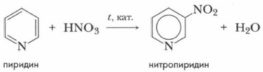 Глава 10. Азотсодержащие соединения Гетероциклические соединенияНо у атома азота молекулы пиридина есть еще неподеленная пара электронов, которая не участвует в образовании ни a-связей, ни д-электронной системы. По этой причине пиридин можно рассматривать как амин, он также проявляет свойства оснований. Как и амины, пиридин, растворяясь в воде, окрашивает лакмус в синий цвет, присоединяет протон при реакциях с минеральными кислотами. Задание. Запишите реакции пиридина с водой и азотной кислотой. Объясните их суть. По сравнению с бензолом пиридин менее реакционноспособен. Он с большим трудом вступает в реакцию нитрования с азотной кислотой, образуя соединение — нитропиридин.