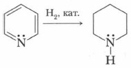 Пиридин вступает в каталитическую реакцию гидрирования. В ходе ее ароматическая система переходит в насыщенную циклическую форму.