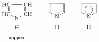 ПирролМолекула пиррола представляет собой пятичленный цикл, содержащий один атом азота. Единое π-электронное облако в пирроле образуется иначе, чем в бензоле и пиридине. В создании его ароматического ядра участвуют 4 р-электрона атома углерода и неподеленная электронная пара атома азота. В структурной формуле пиррола ее целесообразно обозначать двумя точками внутри кольца. Проблема. Почему в формуле (3) пиррола электронная пара атома азота уже не может быть обозначена двумя точками внутри?
