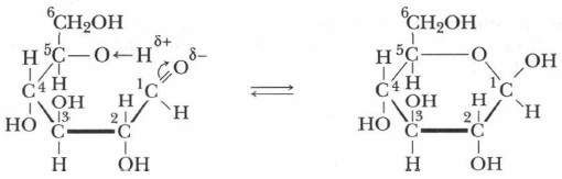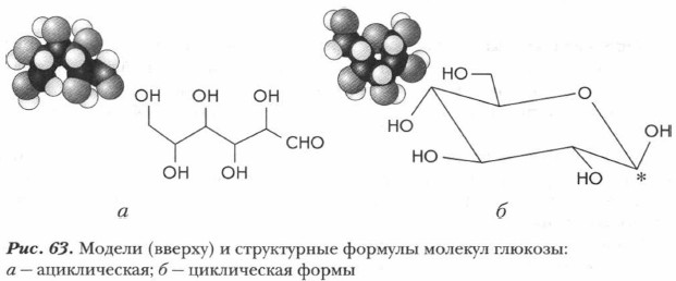 Установлено: если во время внутреннего вращения молекулы альдегидная группа приблизится к спиртовой группе 5-го атома углерода, происходит образование новой химической связи, которое приводит к возникновению замкнутого цикла. Возможность такого химического взаимодействия объясняется тем, что атом кислорода карбонильной группы несет на себе частичный отрицательный заряд, а атом водорода спиртовой группы — частичный положительный заряд. В результате происходит разрыв π-связи карбонильной группы, к атому кислорода присоединяется водород, а кислород спиртовой группы замыкает шестичленный цикл с атомом углерода. Такая перегруппировка атомов приводит к образованию прочного цикла. В результате в растворе глюкозы подавляющее большинство молекул имеет циклическое строение. Ациклическая (альдегидная) форма характерна для очень незначительной части молекул (рис. 63).
