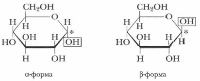 Поскольку гидроксильные группы взаимно отталкиваются, они располагаются не по одну, а по обе стороны плоскости кольца. Следовательно, над и под его плоскостью происходит чередование протонов и ОН-групп (такое строение оказывается наиболее энергетически выгодным). Образовавшаяся в результате замыкания цикла новая гидроксильная группа у первого атома углерода (он обозначен звездочкой) может занимать в пространстве два положения — над или под плоскостью кольца. Она делает этот атом асимметрическим и называется полуацеталъной гидроксильной группой. Именно поэтому возможно существование двух циклических форм: α-формы и β-формы глюкозы: