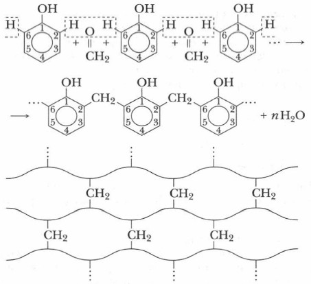Применение полистирола очень разнообразно — от пленки в электрических конденсаторах толщиной 0,02 мм до толстых плит из пенополистирола. Полистирол обладает высокими электроизоляционными свойствами, поэтому его применяют в радиотехнике, на телевидении. Полистирол можно вспенивать газами. При этом образуется пенополистирол, который обладает тепло- и звукоизоляционными свойствами, поэтому его используют в строительстве. Полистирол является нетоксичным полимером, из него изготавливают различную посуду. Фенолоформальдегидные пластмассыФенолоформальдегидные пластмассы (фенопласты). Основой этих пластмасс является фенолоформальдегидная смола, которую получают реакцией поликонденсации. В результате этой реакции образуются высокомолекулярное соединение — фенолоформальдегидная смола и низкомолекулярное вещество — вода. В данной реакции участвуют атомы водорода молекулы фенола, находящиеся в положениях 2 и 6. В кислой среде при небольшом избытке фенола образуются новолаки — низкомолекулярные смолы линейного строения. При взаимодействии фенола и фенолформальдегида, взятых в равных количествах, или при избытке формальдегида образуется резол, который напоминает по структуре новолак, однако некоторые из его бензольных колец содержат группы —СН2ОН. Резолы с небольшой молекулярной массой (800-1000) растворимы в спирте, ацетоне. Такие растворы используются в качестве клеев (БФ-2, БФ-6), лаков, герметиков. К резольной смоле добавляют наполнители (древесную муку, стекловолокно и др.), пластификатор, антиокислители и всю эту смесь нагревают. При повышенной температуре реакция поликонденсации продолжается и во взаимодействие вступает атом водорода фенола, находящийся в положении 4. Линейные макромолекулы «сшиваются» между собой метиленовыми группами от формальдегида. Полимер приобретает пространственную структуру.