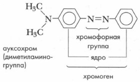 Ядро вместе с хромофорной группой образует окрашенную систему — хромоген. Цвет зависит от того, как хромофоры расположены и связаны между собой. Для усиления цвета, для достижения большей прочности окрашивания, к хромогену должны быть присоединены дополнительные группы — ауксохромы. Как правило, к ним относятся гидроксигруппа —ОН и аминогруппа —NH2.