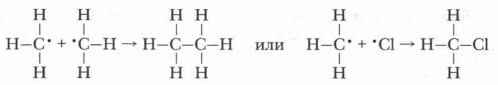 Радикал хлора (атом хлора с неспаренным электроном) реагирует со следующей молекулой метана и т. д. Этот процесс продолжается до тех пор, пока будет идти образование свободных радикалов. Столкновение радикалов может привести к обрыву процесса: