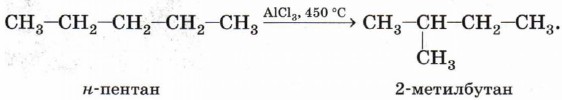 Изомеризация. При нагревании линейных углеводородов с катализатором (хлоридом алюминия) образуются алканы с разветвлённым углеродным скелетом:
