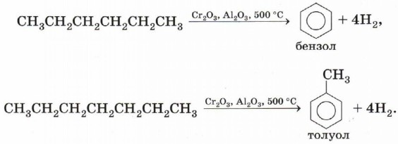 Ароматизация. Алканы с шестью или более углеродными атомами в цепи в присутствии катализатора циклизуются с образованием бензола и его производных: