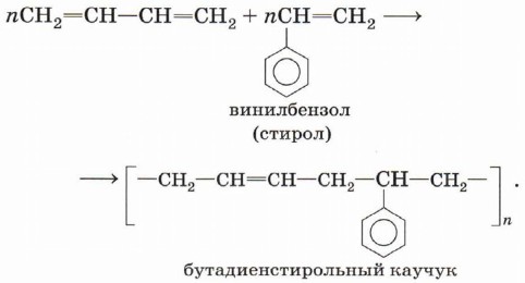 Хлоропреновый каучук используется для изготовления бензо- и маслостойкой резины, трубопроводов для перекачки нефтепродуктов. Некоторые синтетические каучуки представляют собой сополимеры. В качестве примера приведём бутадиенстиролъный каучук, получаемый сополимеризацией бутадиена-1,3 с винилбензолом, называемым стиролом: