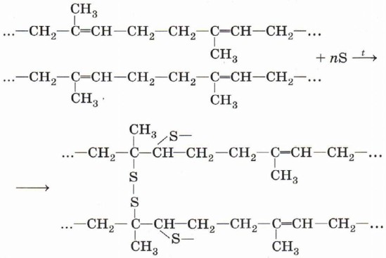 Благодаря уникальной газонепроницаемости бутадиенстирольный каучук используют для изготовления автомобильных камер, а также транспортёрных лент. Синтетические каучуки являются одним из основных продуктов химической промышленности. Из них изготавливают около 50 тыс. различных изделий. Мировое производство каучуков приближается к 10 млн т/год. Натуральный каучук имеет большой недостаток: он сохраняет свои полезные свойства только в узком интервале температур. На морозе он становится хрупким, а при нагревании — мягким и липким. Решить проблему удалось в 1839 г. Американский изобретатель Ч. Гудьир нагрел каучук с порошком серы и получил новый материал, по эластичности не уступавший каучуку, но механически и термически значительно более устойчивый. Спустя 4 года англичанин Т. Генкок назвал этот процесс вулканизацией, а новый материал — резиной (от лат. resina — смола). Каким же образом Гудьиру удалось превратить каучук в резину? Какова химическая сущность процесса вулканизации? При нагревании каучука с серой отдельные полимерные цепи сшиваются между собой за счёт образования дисульфидных мостиков.