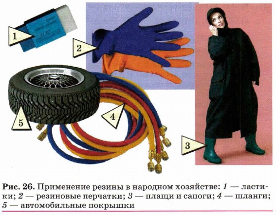 Продукт частичной вулканизации каучука и называется резиной. Такой полимер имеет разветвлённую пространственную структуру и обладает значительно большей прочностью. Резина имеет самые разнообразные области применения в технике, в быту, в промышленности (рис. 26).