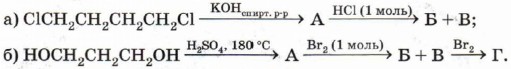 Назовите соединения А, Б, В, Г. 6. При полном сжигании 0,1 моль ациклического углеводорода образуется 5,4 г воды и 8,96 л (н. у.) углекислого газа. При взаимодействии этого углеводорода с эквимолярным количеством брома при 40 °С образуется преимущественно дибромалкен симметричного строения с атомами брома на концах цепи. Определите строение исходного углеводорода.
