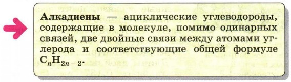 СН2 = С = СН2; СН2 = СН — СН = СН2; СН2 = СН — СН2 — СН = СН2. Эти виды алкадиенов существенно отличаются друг от друга по строению и свойствам. Орбитали центрального атома углерода, образующего две двойные связи, в алкадиенах с кумулированными связями находятся в состоянии sр-гибридизации. Этот атом образует две σ-связи, лежащие на одной прямой и направленные в противоположные стороны, и две π-связи, лежащие в перпендикулярных плоскостях. π-Связи образуются за счёт негибридизованных р-орбиталей каждого атома углерода. Свойства алкадиенов с изолированными двойными связями практически ничем не отличаются от свойств алкенов, разве что алкадиены вступают в соответствующие реакции в две ступени. Орбитали атомов углерода, образующих двойные связи, находятся в sр2-гибридизации.