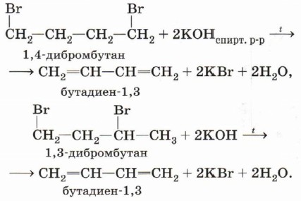 Дегидрогалогенирование. Для получения алкадиенов можно применять стандартный способ создания кратных связей — дегидрогалогенирование, известное вам по теме «Алкены». При действии на дибромалканы спиртового раствора щёлочи происходит отщепление двух молекул галогеноводорода и образование двух двойных связей: