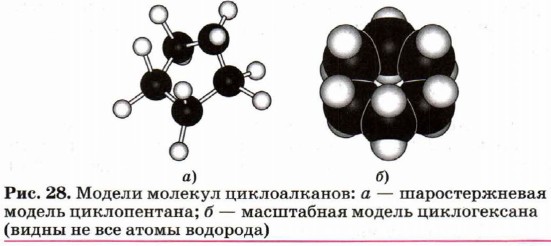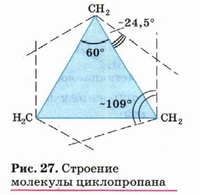 На свойства циклоалкана существенное влияние оказывает устойчивость цикла, непосредственно связанная с его размером. Углеродная цепь органического соединения более устойчива, если валентный угол при атомах углерода близок к тетраэдрическому (109°28'). В цикле, состоящем из трёх атомов углерода (равносторонний треугольник), валентный угол составляет 60°. Таким образом, отклонение каждой связи от нормального положения (угловое напряжение) составляет (109 - 60) : 2 = 24,5°! Это приводит к низкой устойчивости циклопропана (рис. 27). Реакционная способность циклобутана несколько ниже, так как угловое напряжение (если предположить, что циклобутан — плоский квадрат) составляет (109 - 90) : 2 = 9,5°. Циклоалканы с бо́льшим размером цикла (циклопентан и циклогексан) образуют нежёсткие молекулы, поэтому угловые напряжения в них отсутствуют (рис. 28).