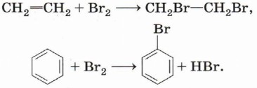Глава 3. Углеводороды Ароматические углеводородыМеханизм реакций электрофильного замещенияРеакции замещения (бромирование, хлорирование и нитрование) протекают под воздействием электрофильных частиц, т. е. являются реакциями электрофильного замещения. Ароматическая структура бензола и подобных ему соединений обладает повышенной устойчивостью, и нарушение её энергетически невыгодно. Это оказывает влияние на химические свойства ароматических соединений. Наличие π-системы, области повышенной электронной плотности, делает структуру бензола выгодной для воздействия электрофилов, но, в отличие от непредельных соединений, эти реакции протекают не как присоединение, а как замещение. Галогенирование. Сравним механизмы реакций бромирования этена и бензола: