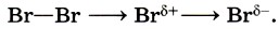 Присоединение брома к этену начинается с электрофильной атаки, которую можно представить как взаимодействие электронов π-связи с поляризованной молекулой Вr2. Электрофильная частица образуется при поляризации связи Вr—Вr при приближении молекулы брома к π-связи алкена:
