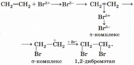 Поляризованная молекула брома взаимодействует с молекулой этена и образует тс-комплекс. На следующей стадии образуется σ-комплекс (карбокатион), стабилизирующийся за счёт присоединения брома и аниона:
