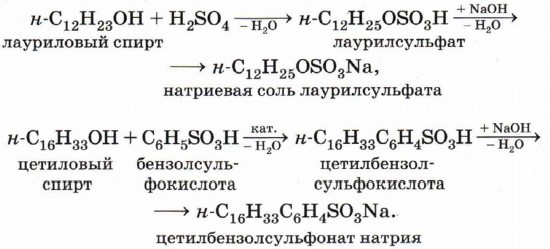 Глава 4. Кислородсодержащие соединения § 21. Сложные эфиры. Жиры (окончание)В жёсткой воде, содержащей ионы Са2+ и Mg2+, мыло теряет свою моющую способность. Это происходит в результате того, что кальциевые и магниевые соли высших карбоновых кислот нерастворимы в воде. Вместо пены в воде образуются хлопья осадка, и мыло расходуется бесполезно. 2C17H35COONa + Са2+ → (С17Н35СОО)2Са↓ + 2Na+ Этого недостатка нет у синтетических моющих средств (CMC), называемых детергентами. Они представляют собой натриевые соли высших сульфокислот или алкилбензолсульфокислот. Алкилсульфаты получают сульфированием высших спиртов серной кислотой, а алкилбензолсульфонаты — алкилированием бензолсульфокислоты с последующей нейтрализацией щёлочью: