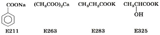11. На сайте Федерального центра цифровых образовательных ресурсов http://fcior.ru найдите тестовое задание «Свойства сложных эфиров» (углублённый уровень) и выполните его. Распечатайте изображение итоговой таблицы тестирования и сдайте учителю. 12. Органическое стекло (плексиглас) получают полимеризацией метилового эфира метакриловой (2-метилпропеновой) кислоты. Напишите уравнение реакции полимеризации, определите элементарное звено полимера. Найдите в сети Интернет предприятия, производящие и реализующие органическое стекло. Какой ассортимент товара они предлагают? По каким ценам? 13. Соли карбоновых кислот широко используются в пищевой промышленности в качестве пищевых добавок. Они выполняют роль консервантов, стабилизаторов, регуляторов кислотности. Назовите соли, формулы и коды которых представлены ниже.